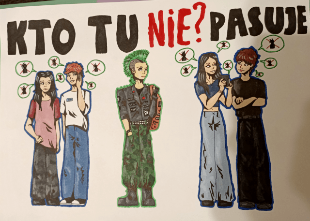 Celem prac było graficzne przedstawienie sytuacji, w której jedna z osób nie jest akceptowana przez grupę z powodu tego jak wygląda, jakie ma przekonania czy jakiej jest narodowości.