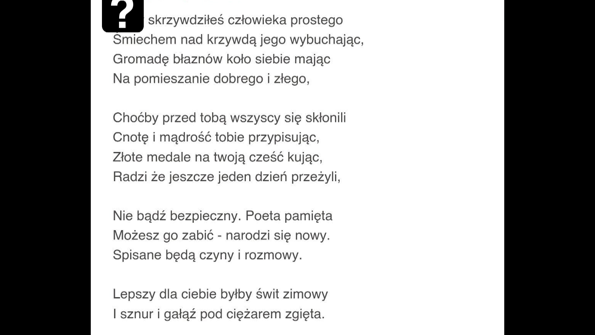 - Hasło – cytat Alberta Einsteina: W y b i t n e / U my s ł y / S ą / Z a w s z e / G w a ł t o w n i e / A ta k o w a n e / P r z e z / M i e r n o t y , / K t ó r y m / T r u d n o / P o j ą ć, / Ż e / K t o ś / M o ż e / O d m ó w i ć / Ś l e p e g o / H o ł d o w a n i a / P a n u j ą c y m / P r z e s ą d o m, / D e c y d u j ą c / S i ę / W / Z a m i a n / N a / O d w a ż n e / I / U c z c i w e / G ł o s z e n i e / W ł a s n y c h / P o g l ą d ó w
